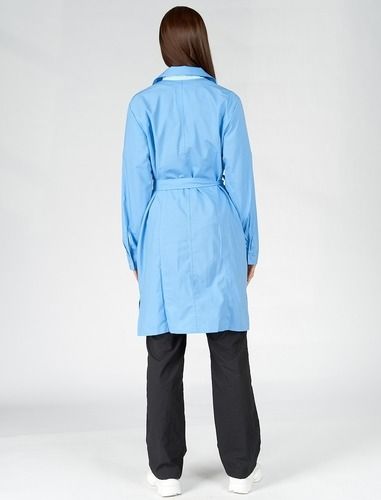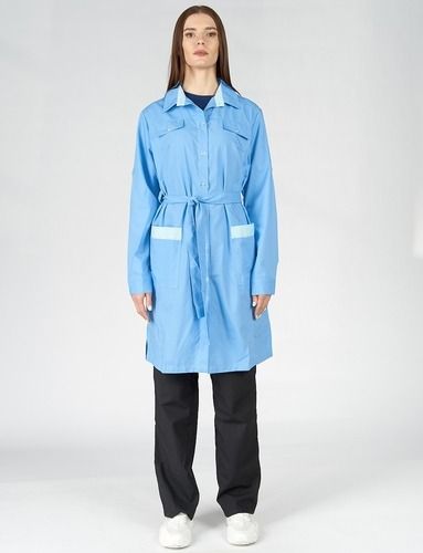 Халат женский удлиненный, полуприлегающего силуэта с центральной бортовой застежкой на петли и пуговицы. На пуговицах с отложным воротником, накладные два боковых кармана и один верхний. Спинка с хлястиком по линии талии. Особенность: паты на рукаве (пата служит именно для целей, как показано на картинке – завернуть рукав и закрепить его в завернутом виде).