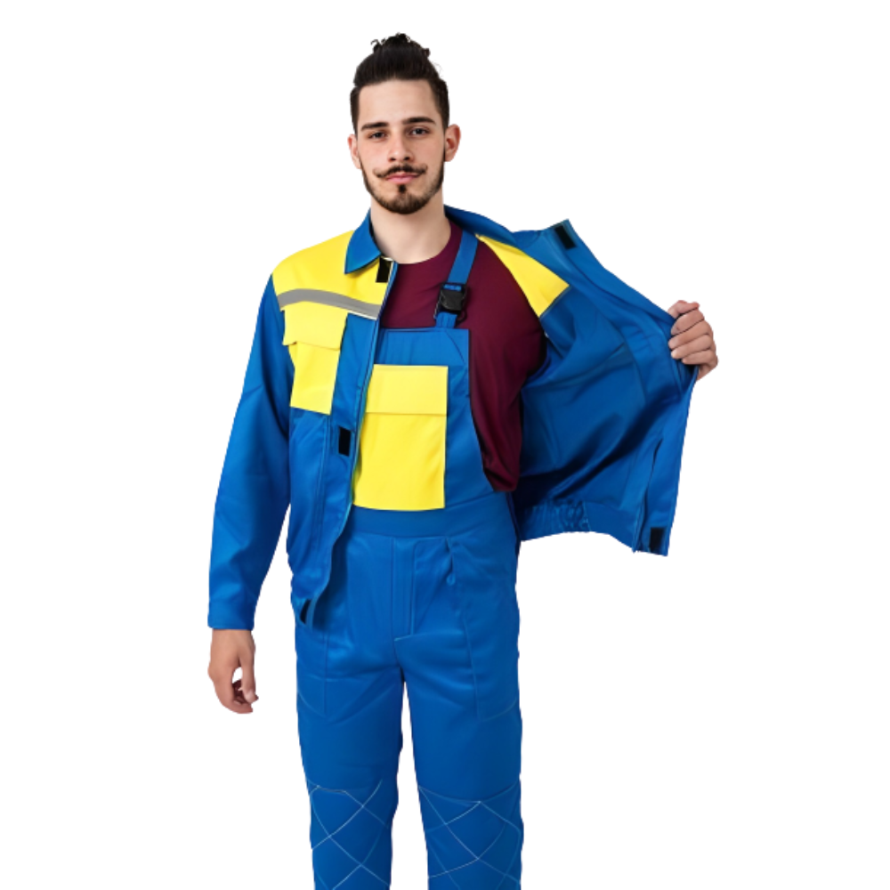 Антистатическая ткань. 51% х/б, 49% п/э, пл.210г/м2. ВО. СВО на рукавах и штанах. ТР ТС 019/2011. Костюм рабочий состоит из куртки и полукомбинезона. Куртка с отложным воротником, с центральной застежкой на молнии, ветрозащитная планка застегивающейся на кнопки. Карманы нагрудные накладные, нижние карманы накладные со скошенным входом. Рукав с манжетами на пуговицах. Особенность: мягкие стеганые колени утепленные синтепоном.