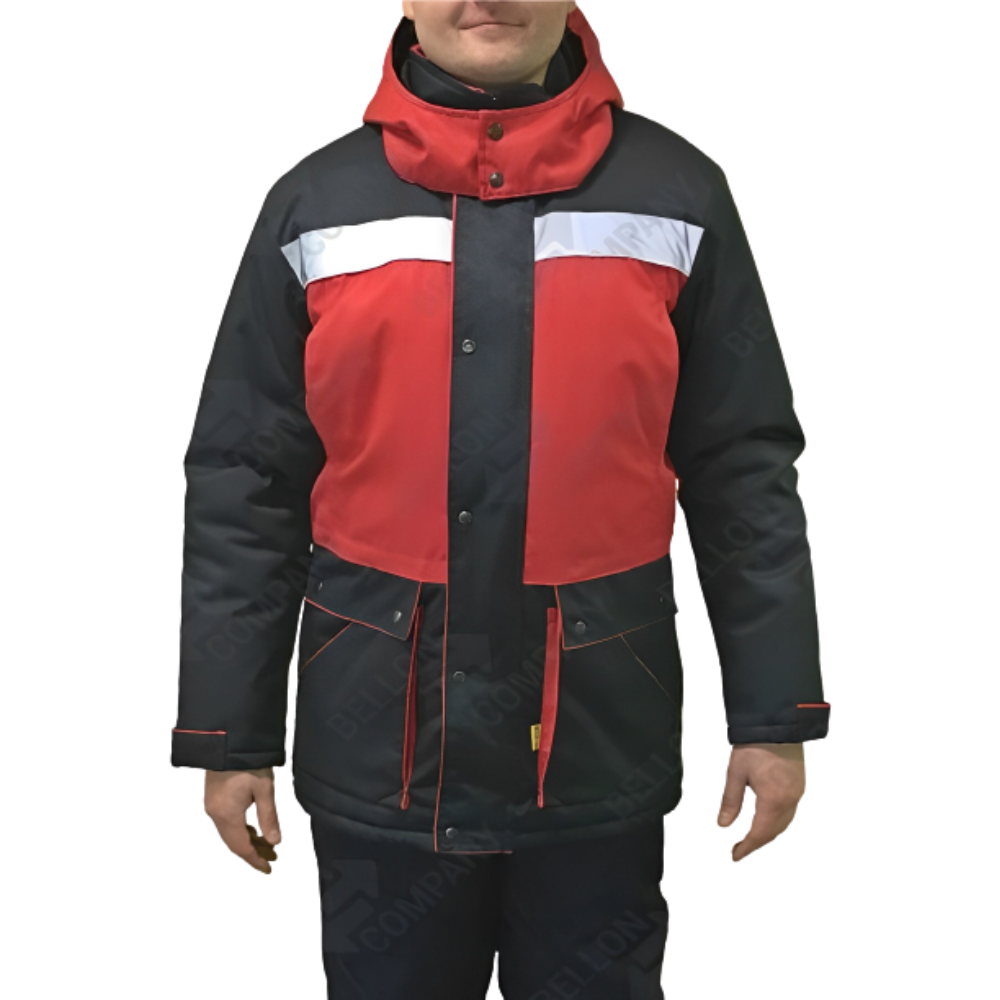 Куртка рабочая, утепленная с центральной застежкой на молнию и ветрозащитным клапаном. Перед и спина с отрезными кокетками, выполненными из отделочной ткани. На правой части переда вертикальный нагрудный карман “в рамку” на молнии и карман для мобильного телефона/рации, два нижних кармана с листочкой. Верхняя деталь рукава из отделочной ткани, низ рукава с внутренней манжетой. По швам притачивания кокеток и притачивания нижней детали рукава настрочена световозвращающая лента 5см. Воротник – стойка. Низ куртки с притачным поясом на резинке. Капюшон утепленный отстегивающий. Светоотражающая лента серебристо-серого цвета обеспечивает безопасность работника, находящегося в условиях ограниченной видимости.